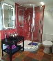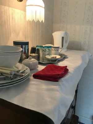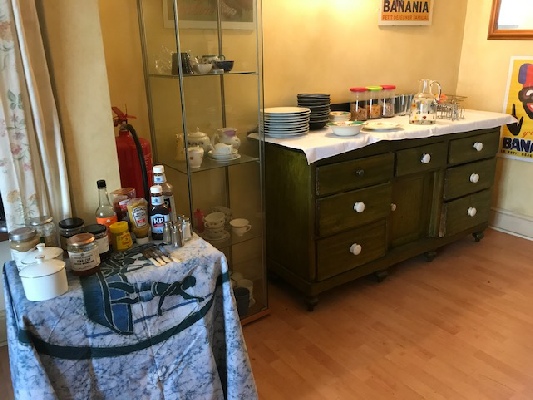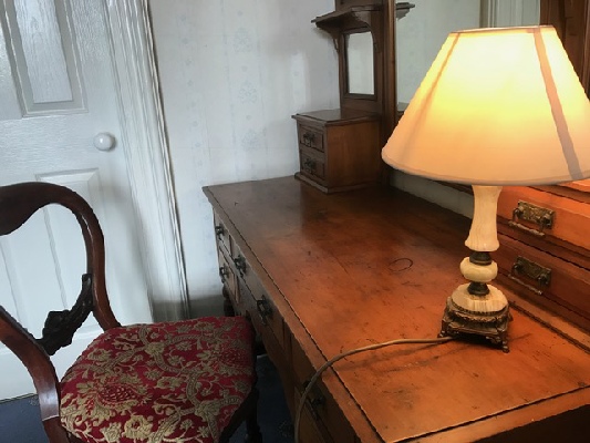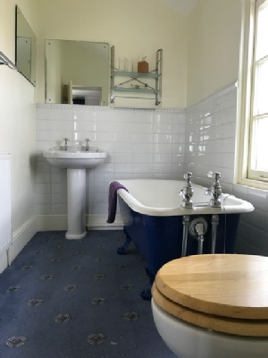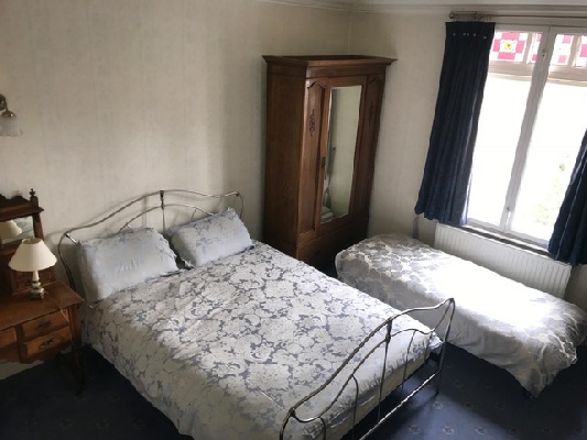 Bedroom 1 - large bedroom with high corniced ceiling and its own fireplace (not in use). This bedroom has its own bathroom which contains a Victorian, cast iron enameled bath with claw feet as well as a wash basin and WC. Apart from the bed the furniture is antique. The King size bed is brushed steel and very comfortable. This bedroom has the floor space to allow 2 x single fold-up beds.