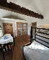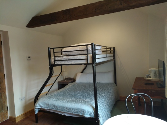 The Loft Room - family suite with triple bunk (1 double bed down and 1 single bed up), and en suite shower room with shower cubicle, WC and wash basin. This bedroom features oak beams and reclaimed pine floorboards.