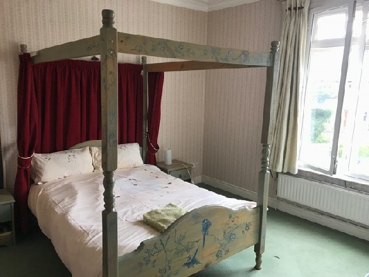Bedroom 2 - large bedroom - also with high corniced ceiling - and its own fireplace (not in use). This bedroom has its own shower room. It features a hand painted pine 4 poster double bed. This bedroom has the floor space to allow 1 x single fold-up bed.